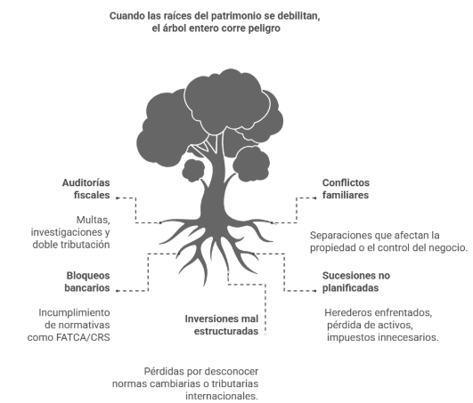 Identificación de aspectos sensibles: sucesión empresarial, participación accionaria, políticas de inversión, rencillas familiares, confidencialidad, exclusión de socios y potenciales sanciones o bloqueos fiscales.